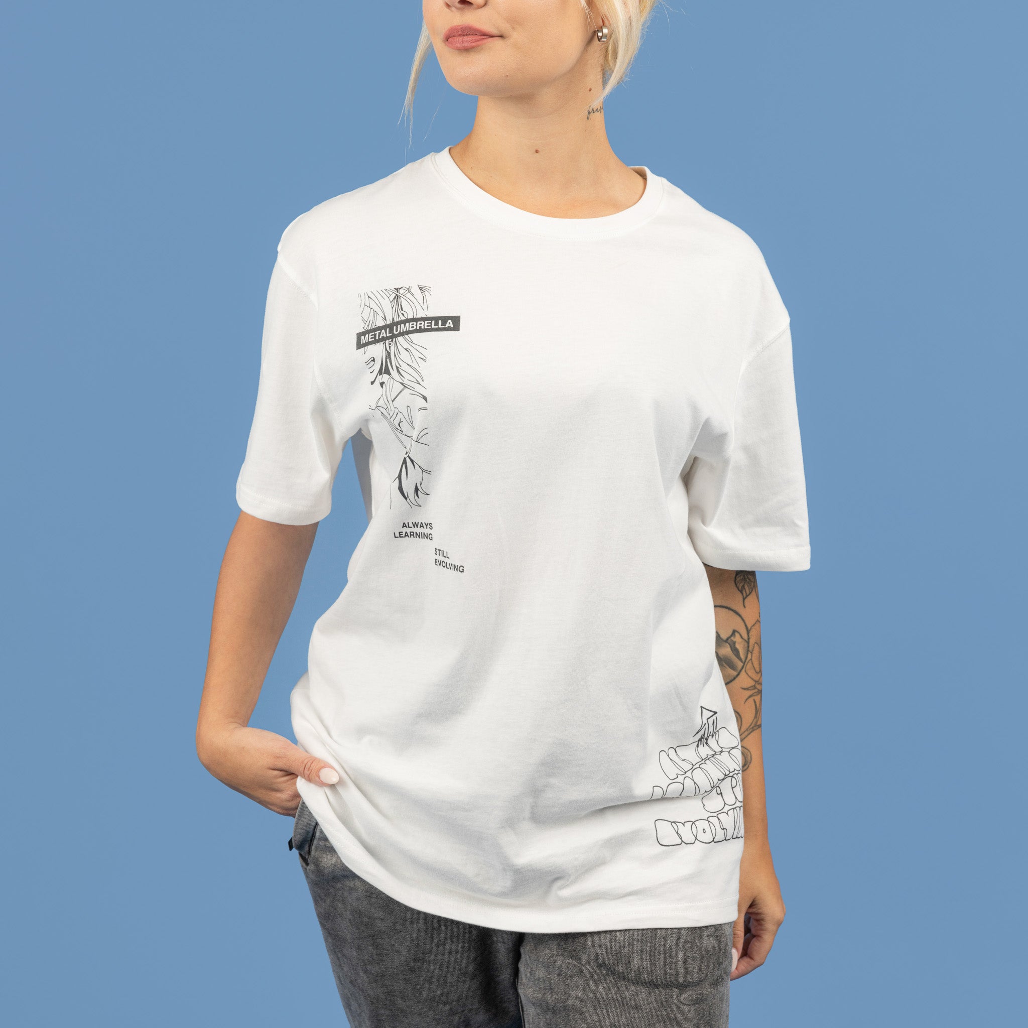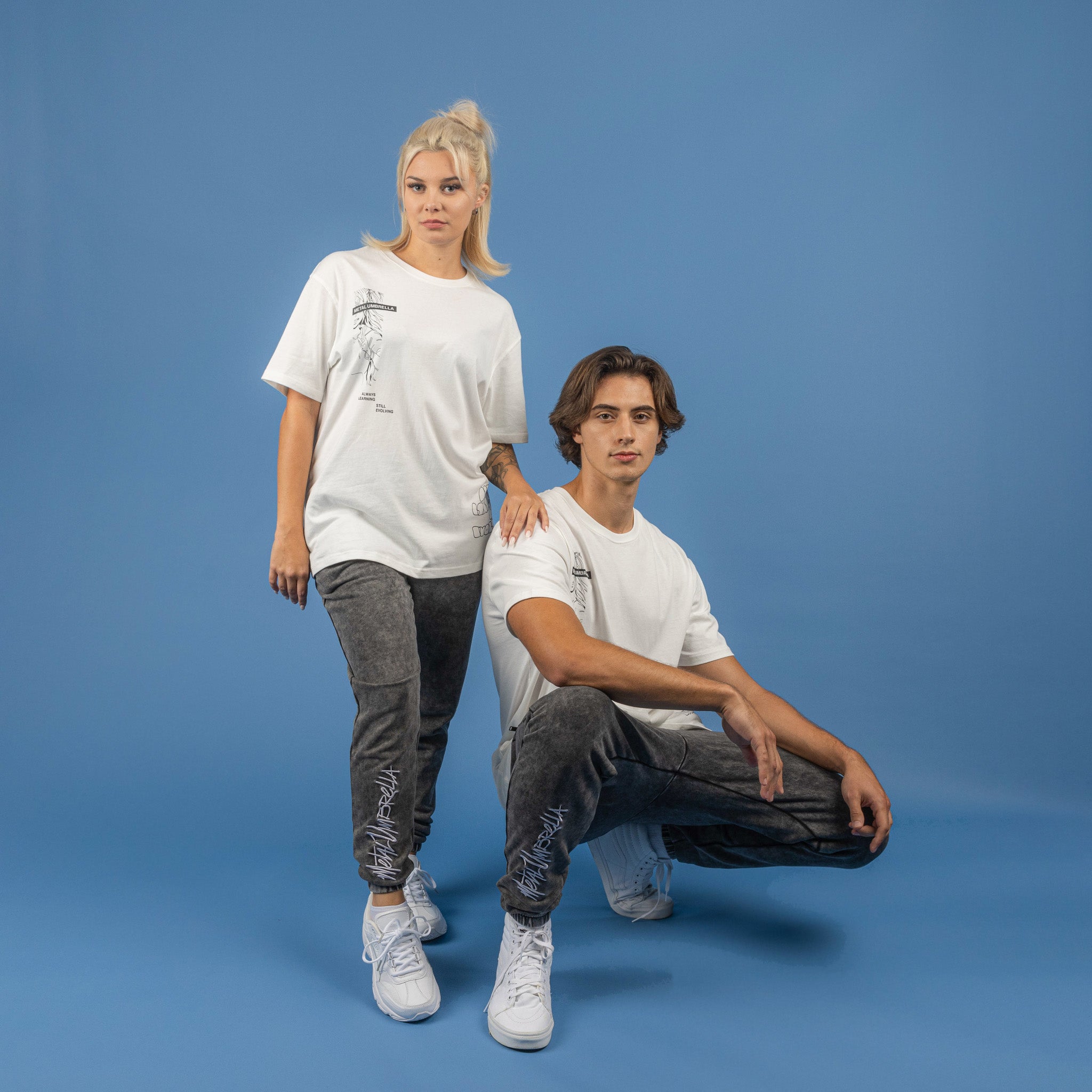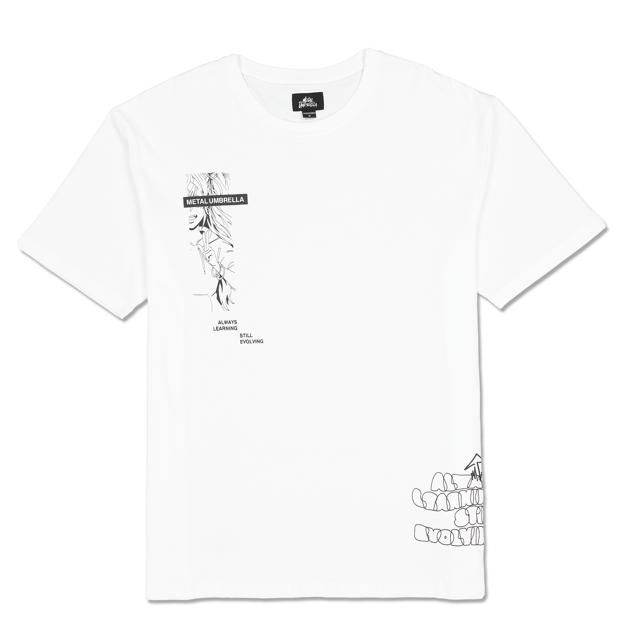 - Collection-unique slogan in bold lettering printed on bottom right front