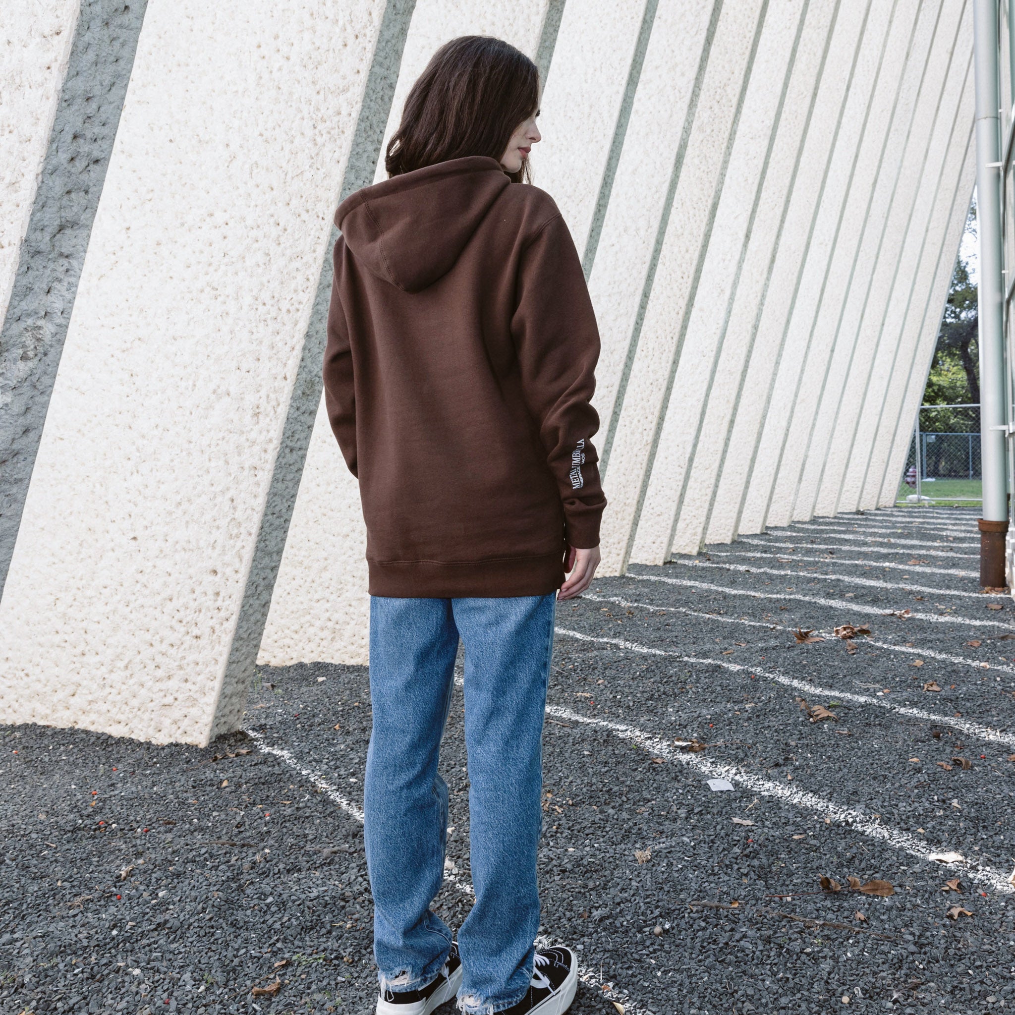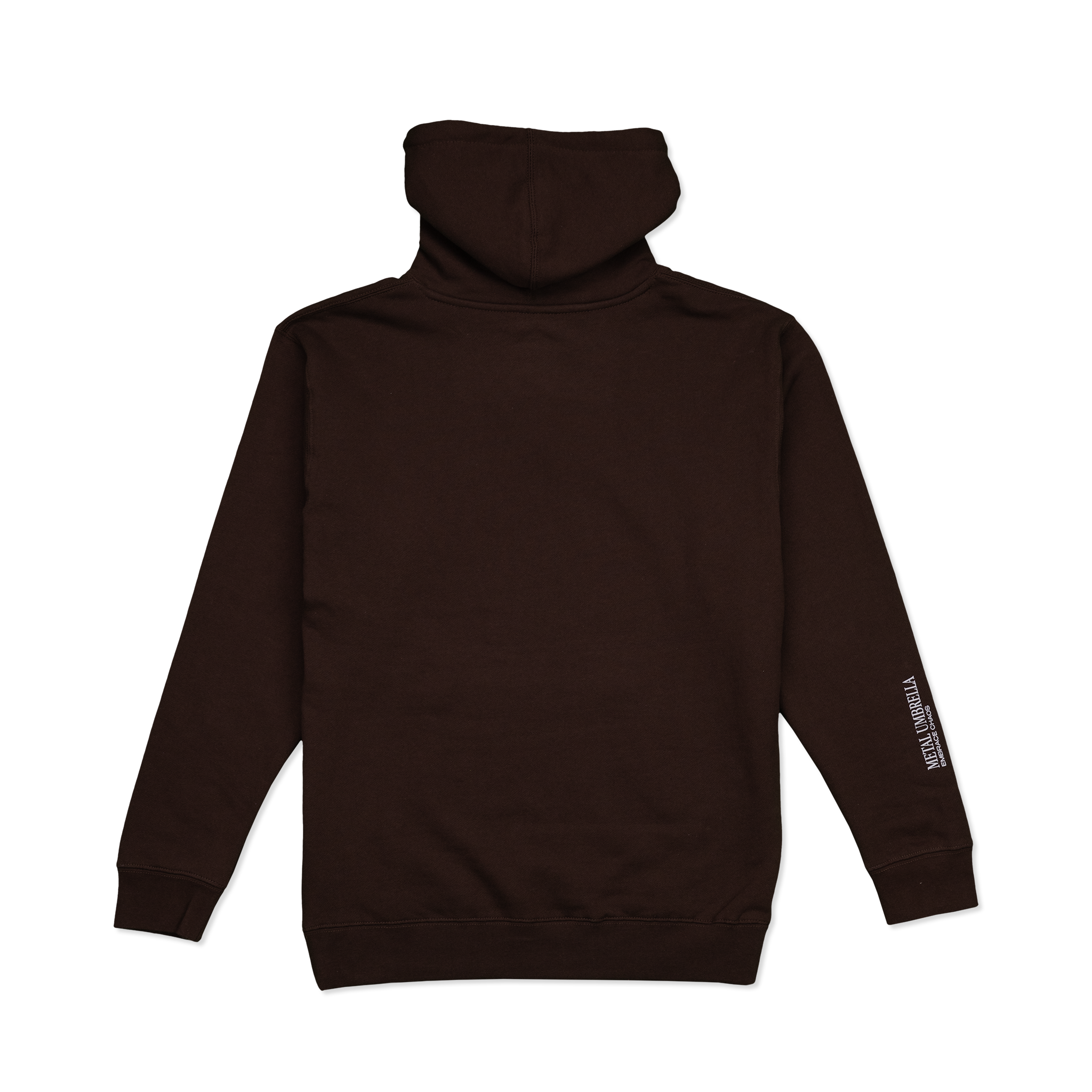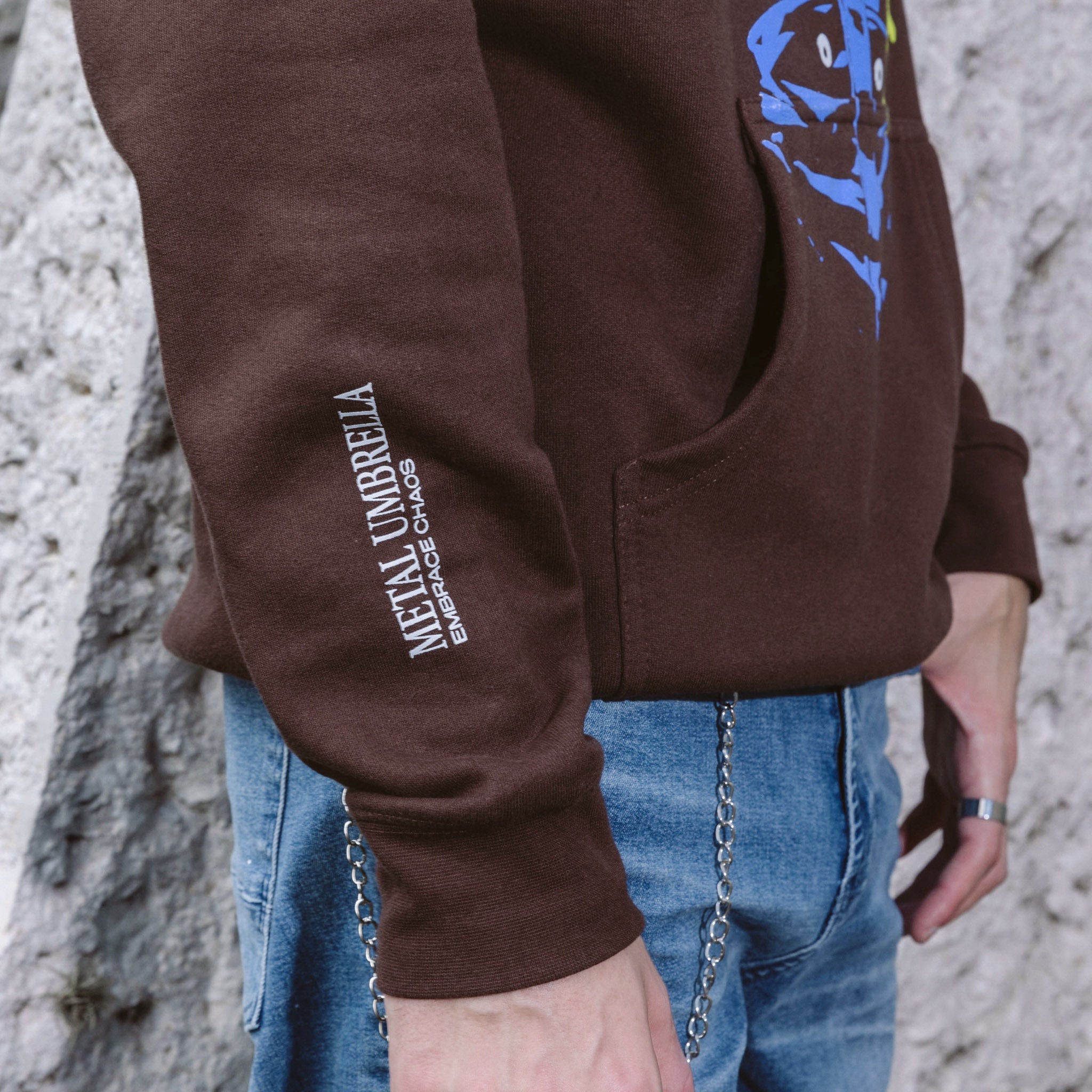 Brown hoodie featuring the sinister Raptor in graphics on the front and sleeve. Just a little bit vicious.