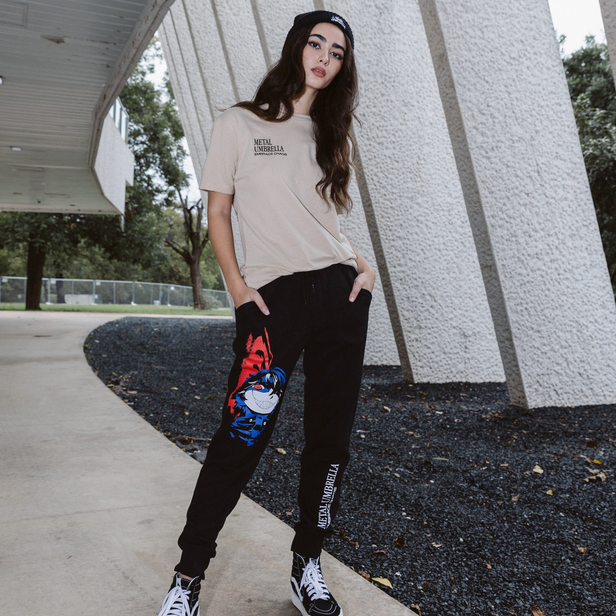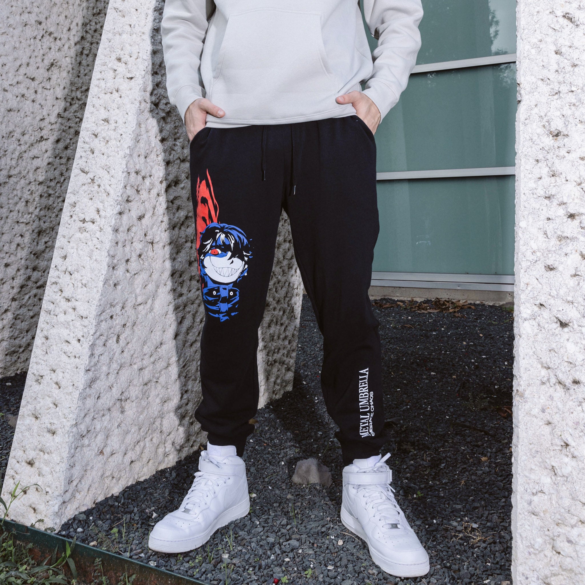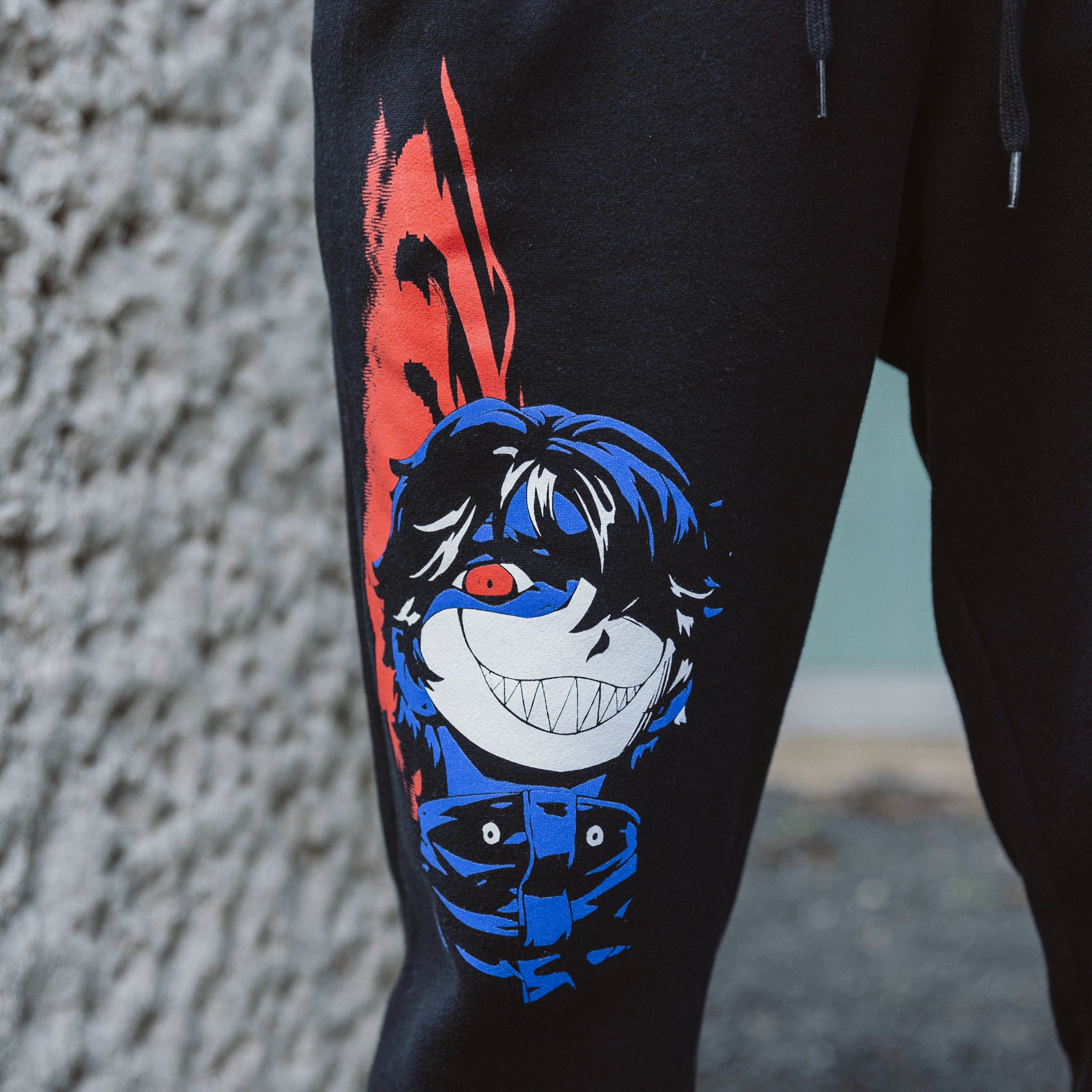 These black joggers make their reputation as heavy, sustainable loungewear with a mischevious side. Villain print in red and blue down one leg, wordmark on the other.