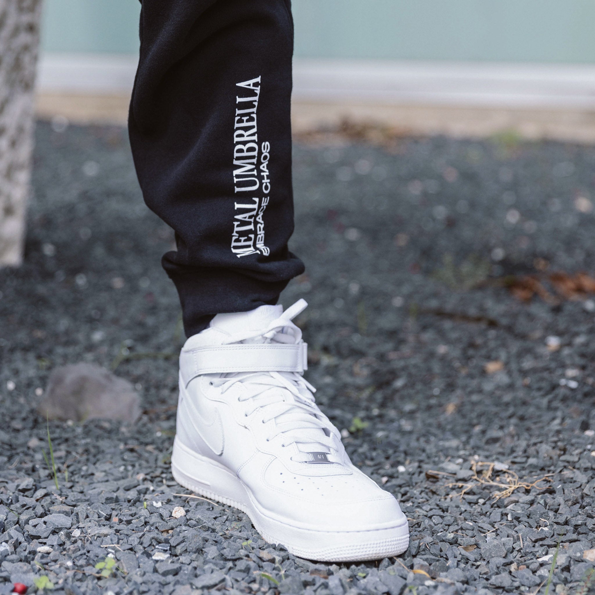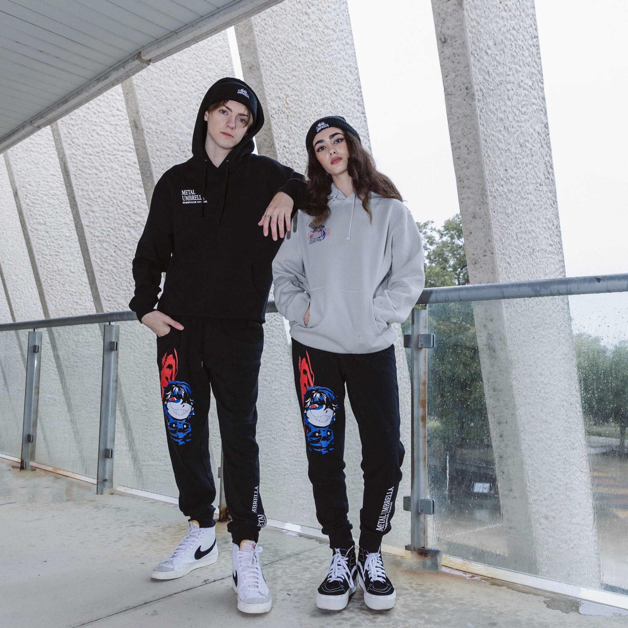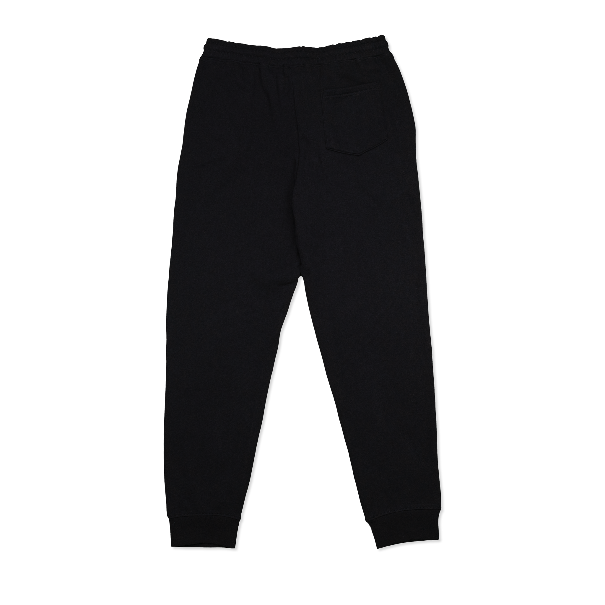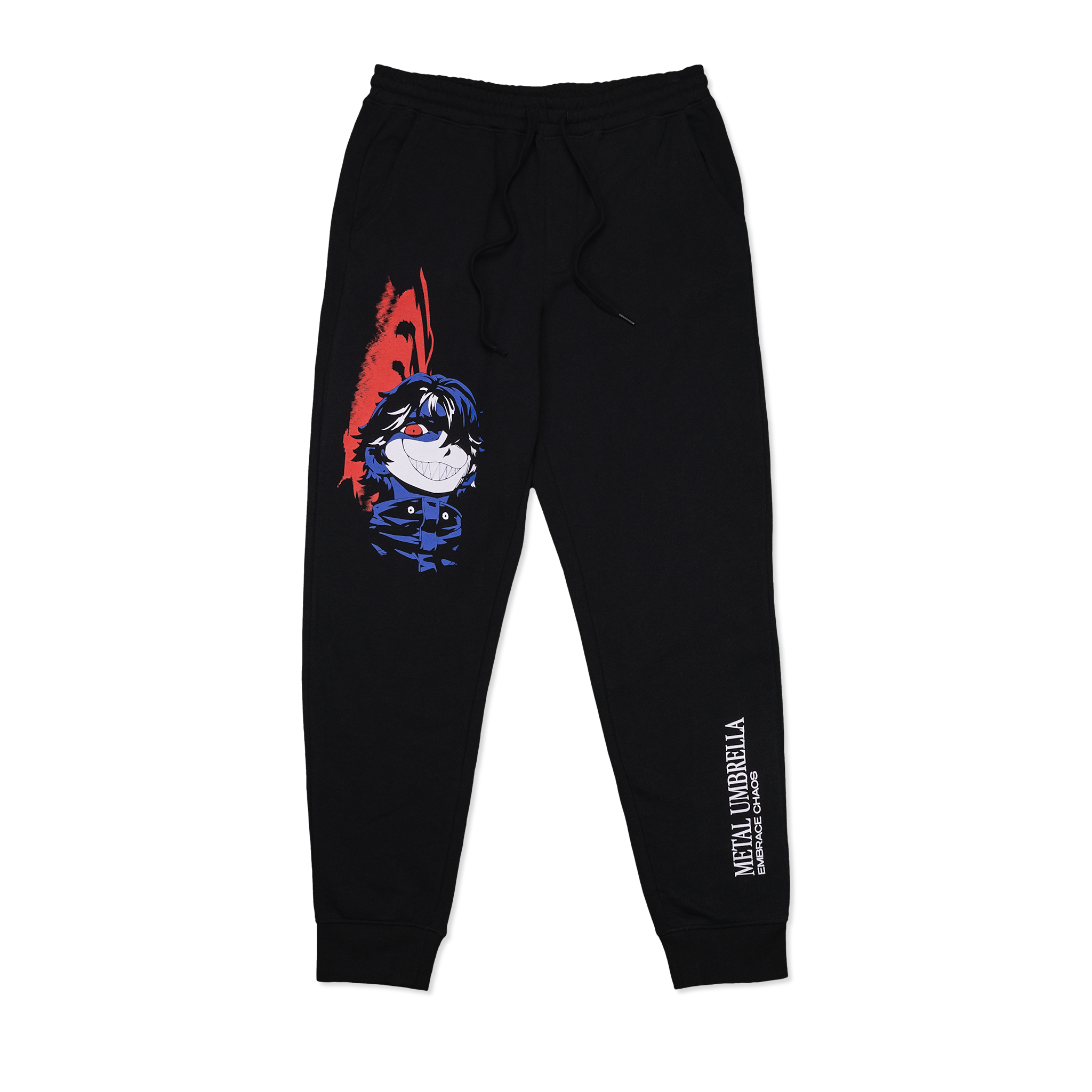 These black joggers make their reputation as heavy, sustainable loungewear with a mischevious side. Villain print in red and blue down one leg, wordmark on the other.